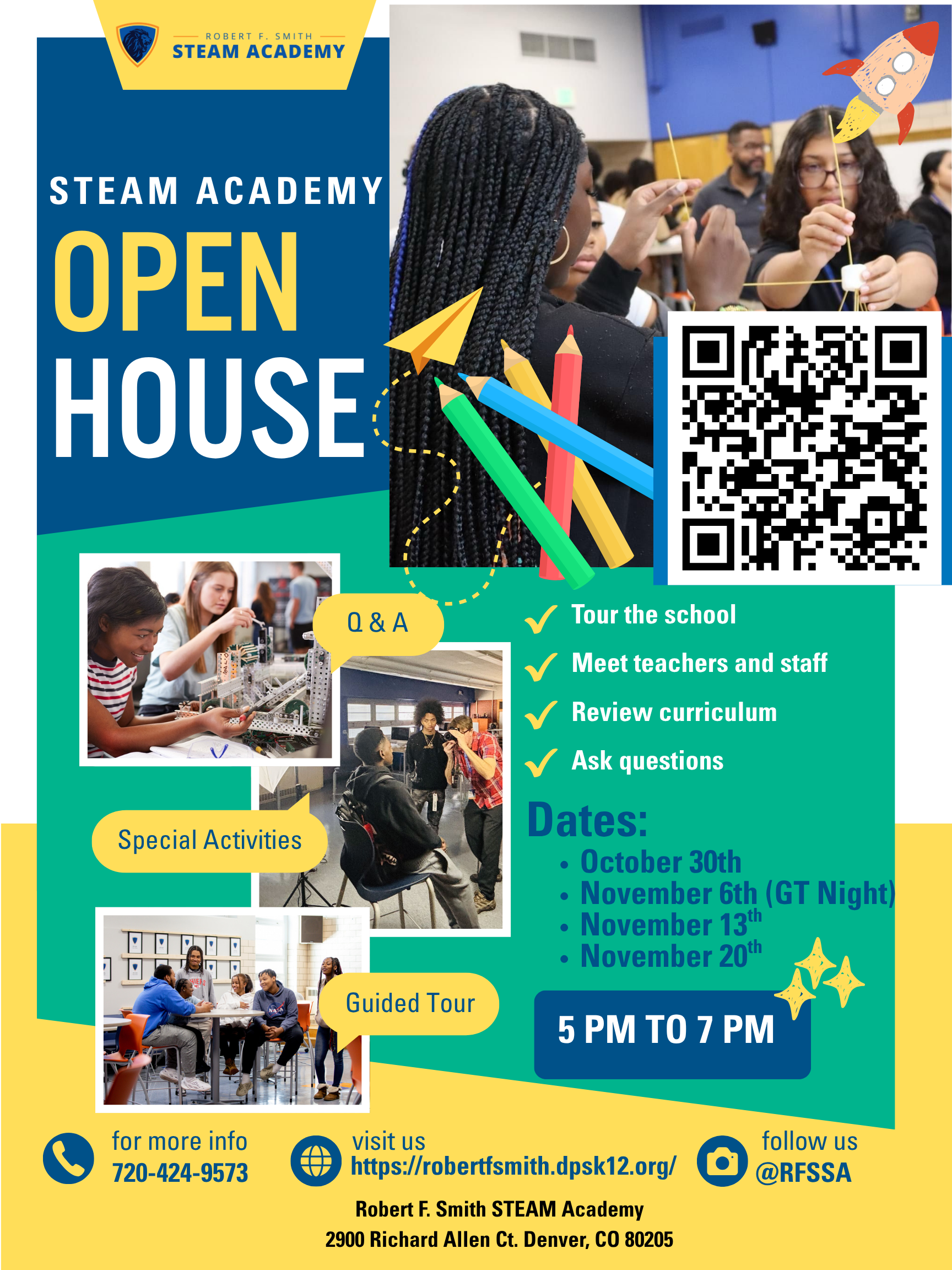 You’re invited to discover what makes Robert F. Smith STEAM Academy one of Denver’s most exciting high schools! Join us for our Open House Nights and learn how we’re preparing students to lead in the fields of Science, Technology, Engineering, Arts, and Mathematics.