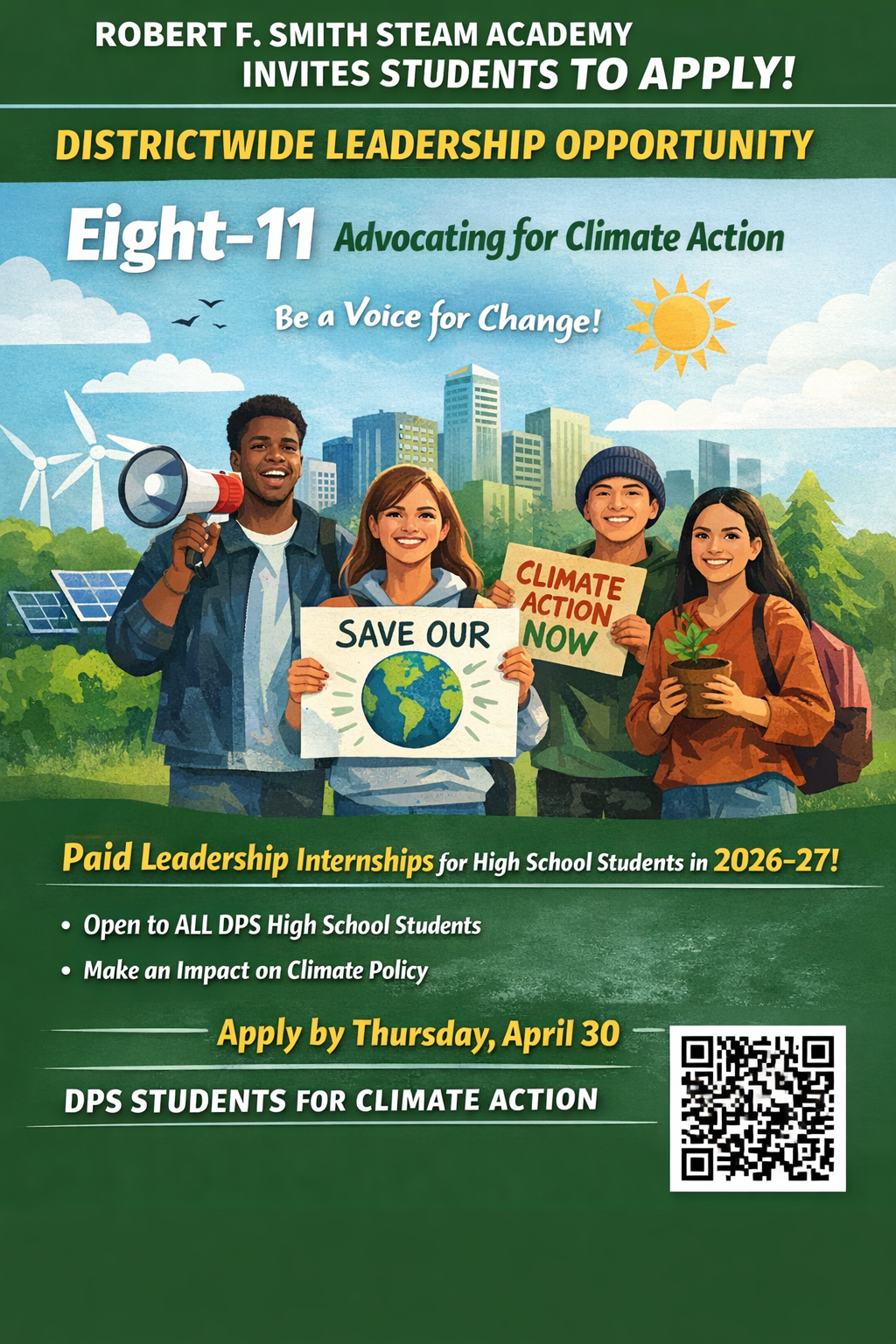 The DPS Students for Climate Action Application is due by Thursday, April 30.